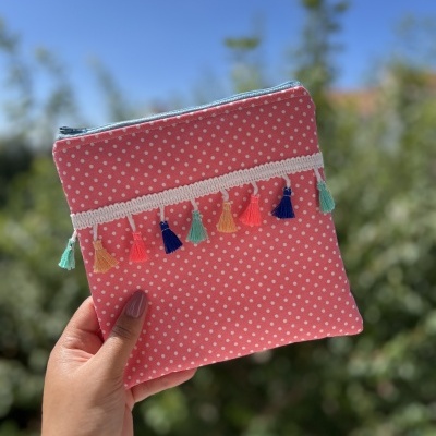 A Nécessaire Bolinhas da Grow Store by Eliza é a tua nova melhor amiga para manter tudo organizado com estilo. Com um fundo coral de bolinhas brancas e tassels super divertidos, é perfeita para guardar os teus essenciais com muita personalidade.
